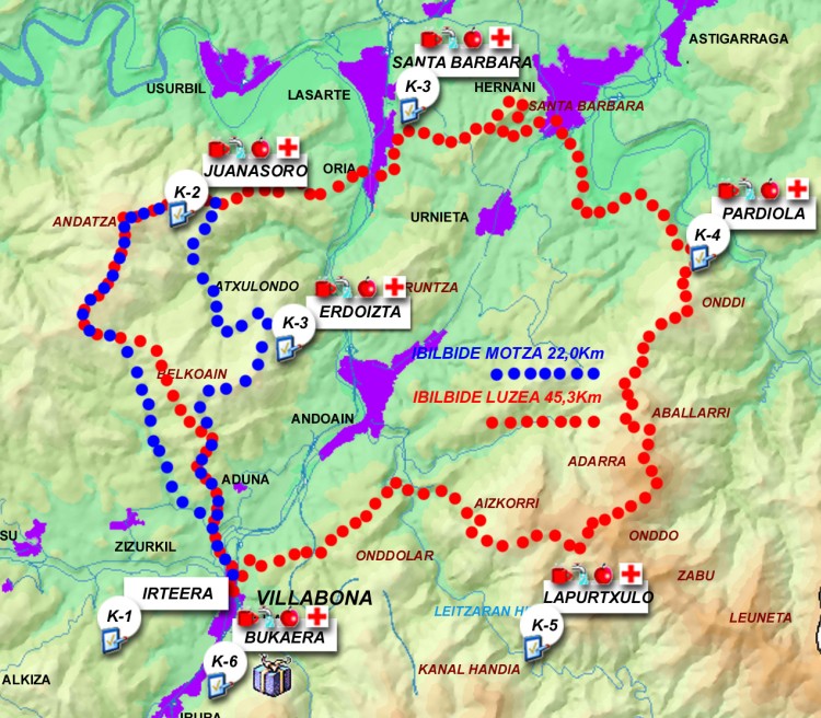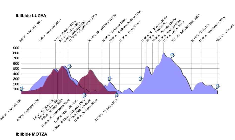Luzera erdiko ibilbideak berriz, 22 Km inguruko luzera du Villabona (61m) - Lepasoro (105m) - Eskatzu (512m) - Andatza (560m) - Juanasoro (330m) - Atxulondo (165m) - Erdoizta Basoa (370m) - Belkoain (489m) - Basopeta (300 m) - Villabona (61) - Villabona-tik igarotzen delarik, eta 1100 metro inguruko desnibel gehitua du, BOST ordu inguruan burutzen dena.