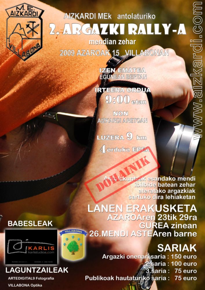 | 1.- AURKEZPENA Villabonako Aizkardi Mendizale Elkarteak, argazki eta mendizaletasuna bateratu nahian, mendiko ibilbide erraz batean zehar egingo den argazki rally-a antolatu du 2009ko azaroaren 15erako. Partehartzaileek aurrez markatutako ibilbidea burutu beharko dute, zeinetan egun berean jakitera emango den, eta natura zein mendiarekin erlazionaturik egongo den gai zehatz bati buruz argazkiak atera beharko dituzten. Mendian buruturiko ekintza izaki, arropa zein oinetako egokiak erabiltzea gomendatzen da. |