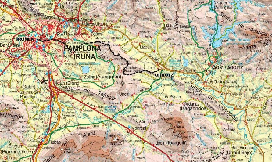 Mendebaldera jaitsiko gara aldapa malkartsuan behera, bide estu belazetsu bat hartuta, beti hiriburua eta Gorraiz golf-zelaia (eskuinaldera pixka bat) aurrean ditugula. Ezkerretara, behean, Ardanatz herria dago; hara doan bidea alde batera utzi, eta golf-zelaitik datorren bide zabal bat hartuko dugu. Ezkerretara joango gara, Ardanatz aldera, baina berehala topatuko dugu Iruñako Bidea, eskuinetara, eta Aranguren haraneko errepidera eramango gaitu. Errepidea zeharkatu, eta asfaltozko pista bat hartuko dugu ezkerrera; kilometro pare bat eginda, Badoztain herrira iritsiko gara, soro artean. | |||